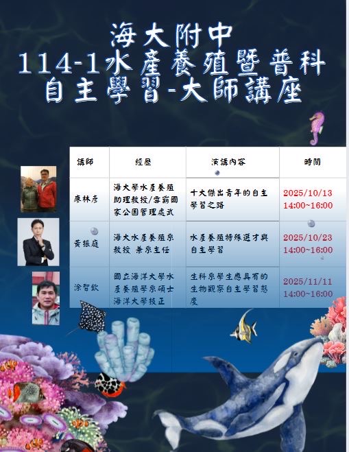 一、校內將辦理系列講座,主題扣合水產養殖及自主學習內容。