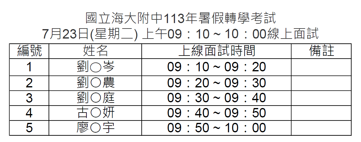 請依上面公告時間,提早5分鐘上線等待面試。國立海大附中113年暑假轉學考試線上面試 準備室 7月 23日 (星期二) · 08:50 - 09:50視訊通話連結:https://meet.google.com/puf-tseh-sze