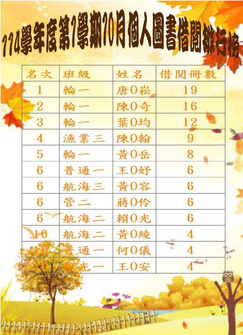公告: 10月份借閱排行榜~~~學期借閱排行前10名記嘉獎乙次