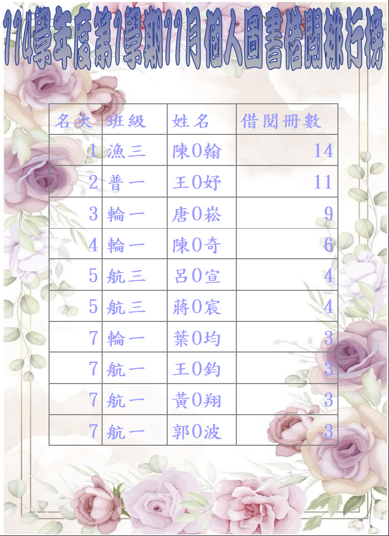 Download this file (114學年度第1學期11月個人圖書借閱排行榜.JPG)114學年度第1學期11月個人圖書借閱排行榜.JPG [271 kB] 2025-12-05 13:58