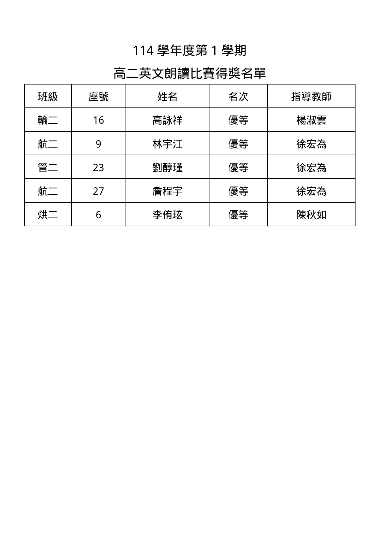 公告114學年度第1學期 高二英文朗讀比賽得獎名單