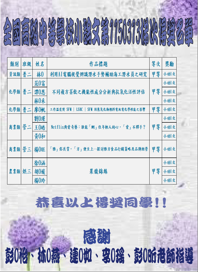 公告: 全國高級中等學校小論文寫作第1150313梯次得獎名單!恭喜得獎同學!!