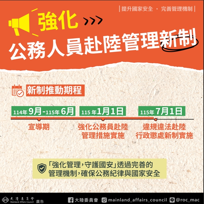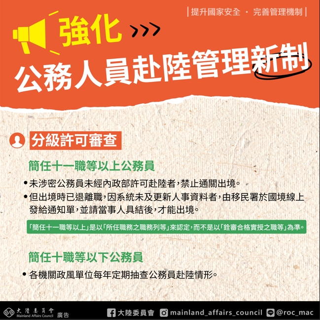 (二)「簡任十一職等以上人員未經內政部許可原則不准出境赴陸」、「公務員赴陸有異常情事或失聯之通報機制, 由各機關政風單位主責向陸委會、內政部及法務部進行通報」及「全國各機關定期抽查違法赴陸機制,由機關政風單位主責每年辦理」,定自115年1月1日起正式實施。