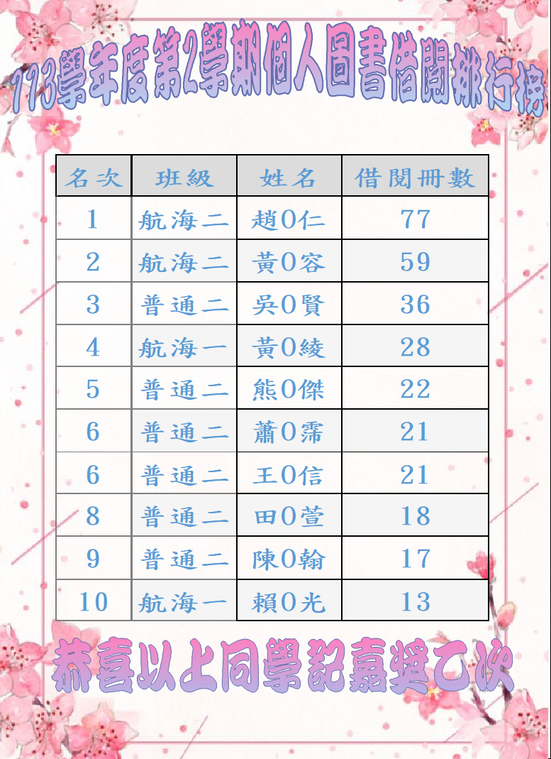 公告: 11月份借閱排行榜~~~學期借閱排行前10名記嘉獎乙次