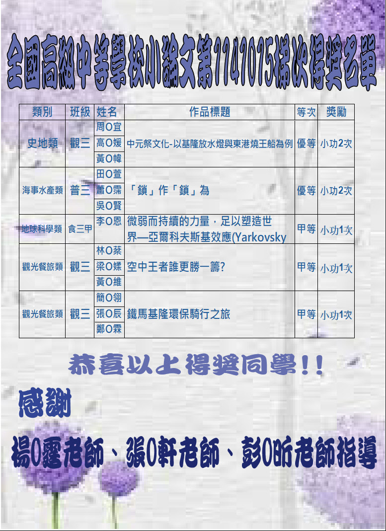 公告: 全國高級中等學校小論文寫作第1141015梯次得獎名單!恭喜得獎同學!!
