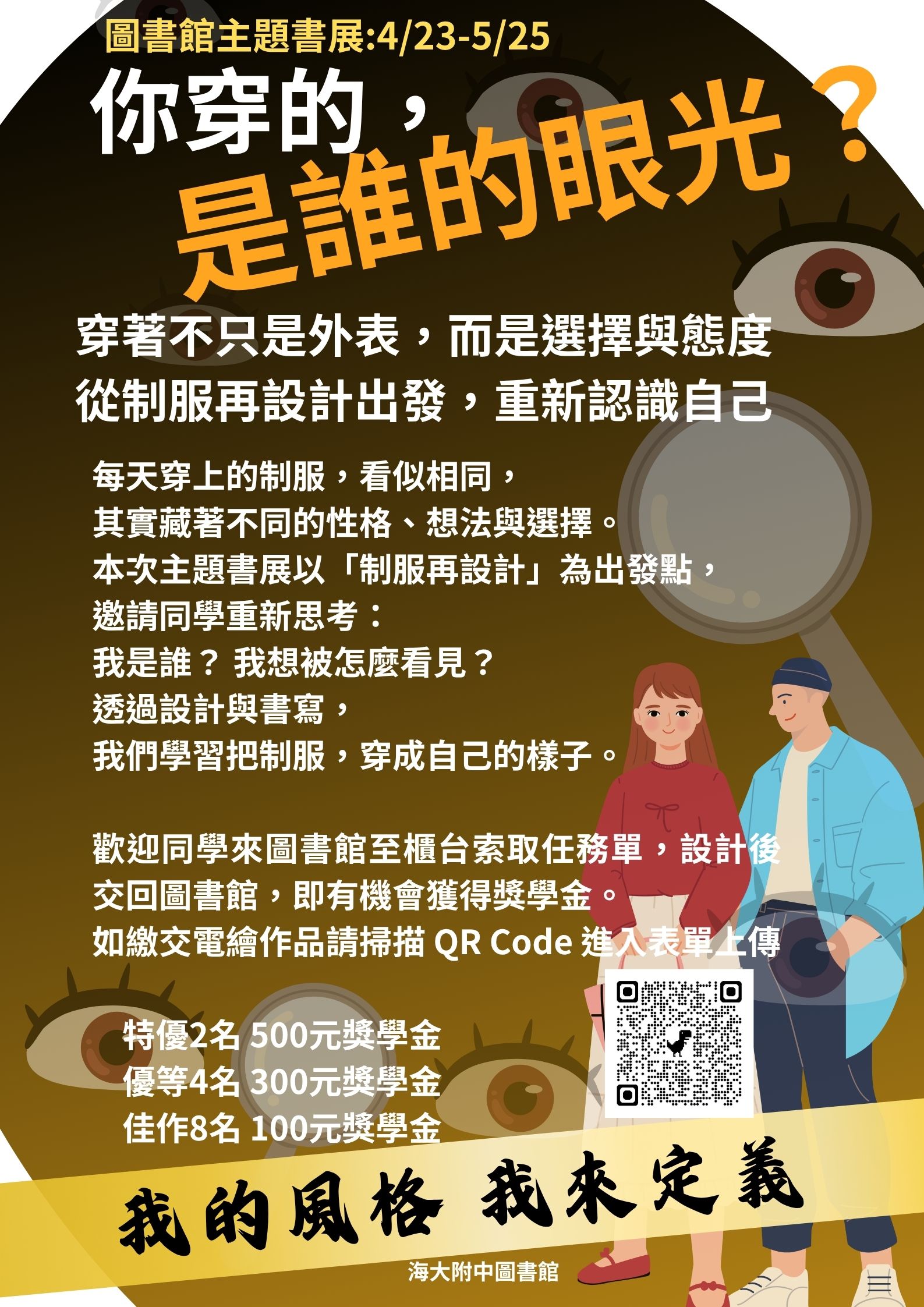 公告:「穿⾐哲學」主題書展(4/23~5/25),歡迎同學踴躍報名參加